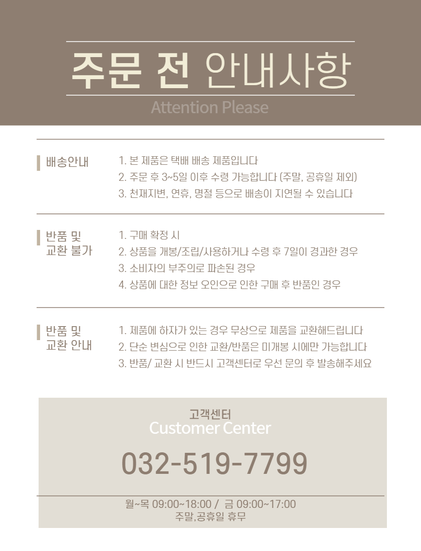 (주)파티오 032-519-7799 로 연락바랍니다. 소비자의 변심으로 인한 반품은 왕복요금을 부담하셔야 합니다. 파손된 제품은 교환해 드립니다. |