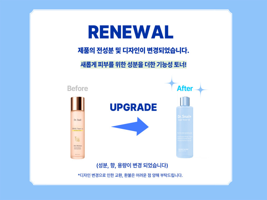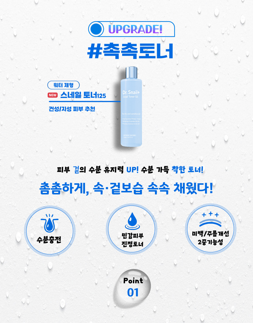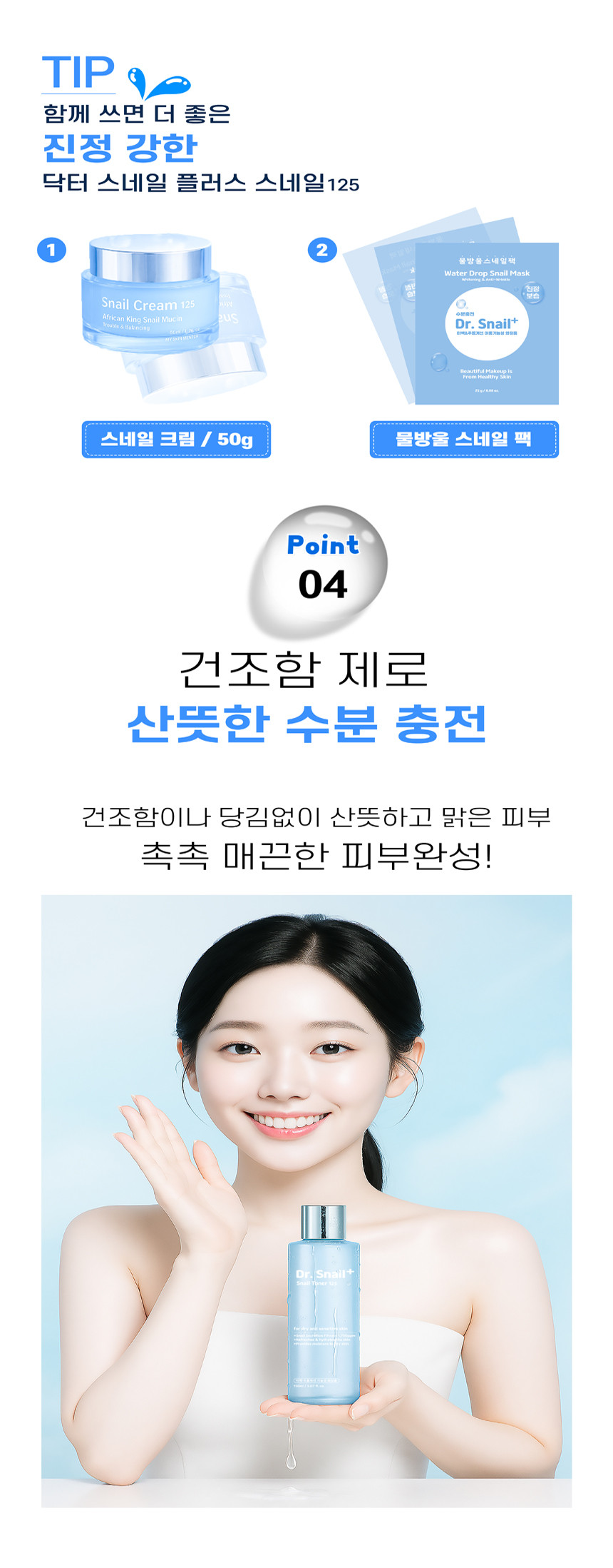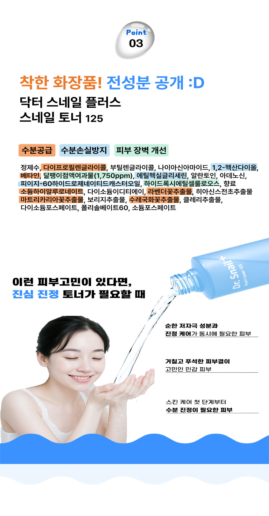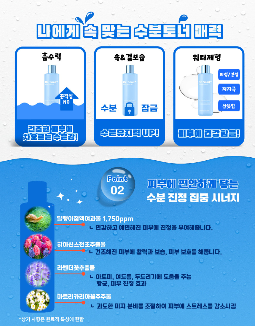 | 주요성분 | 정제수, 다이프로필렌글라이콜, 부틸렌글라이콜, 나이아신아마이드, 1,2-헥산다이올, 베타인, 달팽이점액여과물(1,750ppm), 에틸헥실글리세린, 알란토인, 피이지-60하이드로제네이티드캐스터오일, 하이드록시에틸셀룰로오스, 아데노신, 소듐하이알루로네이트, 다이소듐이디티에이, 라벤더꽃추출물, 마트리카리아꽃추출물, 보리지추출물, 수레국화꽃추출물, 클레리추출물, 히아신스전초추출물, 다이소듐포스페이트, 폴리솔베이트60, 소듐포스페이트, 향료 |