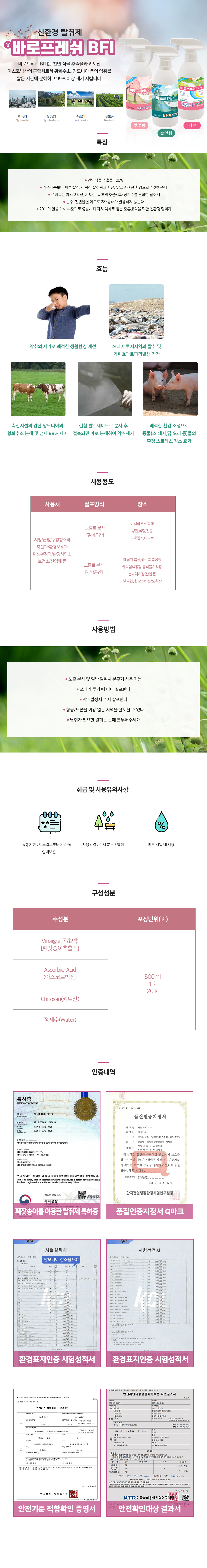 | 품명 및 모델명 | [500ml] 친환경 탈취제 바로프레쉬 BFI 희석제품 (실내탈취제 집안 담배냄새 애완동물 배변냄새 화장실 암모니아 하수구 냄새제거) |