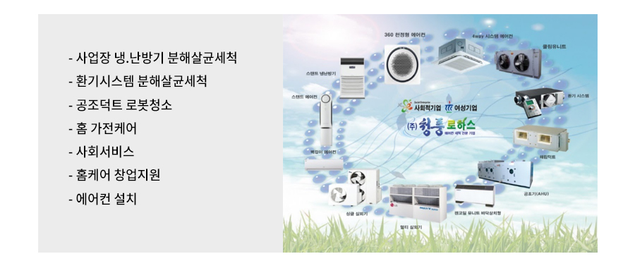 문명이 발달하고 삶의 질이 높아지면서 냉.난방기의 사용이 보편화 돼있어 편리한 생활을 영위하지만 에어컨의 특성상 실내의 공기를 빨아드려 순간적으로 냉각시켜 다시 내보내는 원리의 에어컨은 공기중의 미세먼지와 비말을 포함한 오염물질까지 빨아드리고 열교환기 및 송풍팬 물받이에 오염물이 장착되어 각종 곰팡이와 세균이 번식할 수 있는 최적의 장소가 되고 있어 주기적인 에어컨 분해살균세척을 통해 쾌적한 공기질을 유지하고 에너지 절감에 기여함을 목적으로 함